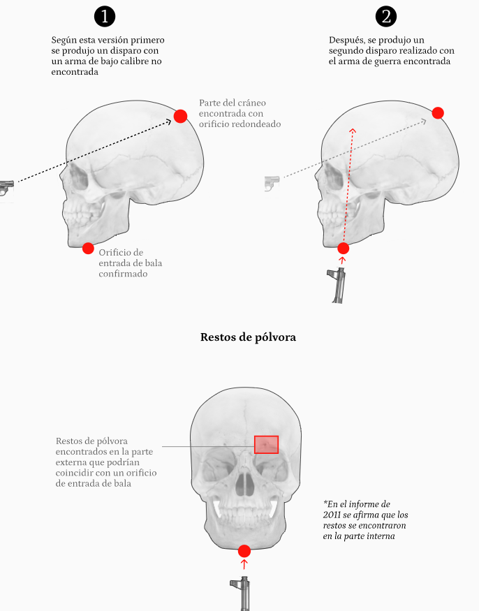 “Allí se puede ver un cadáver perfectamente alineado y en posición recta, como un tronco caído, lo que no es concordante con un individuo que en vida se pega un tiro de fusil bajo la mandíbula estando sentado, menos aun cuando ha ocurrido una destrucción masiva del encéfalo, lo que conlleva a una desconexión neurológica absoluta e instantánea, por lo que no cabría esperar que ocurriesen movimientos agónicos y/o reflejos en estas condiciones, que llevasen a las cuatro extremidades a alinearse con el eje principal del cuerpo, y extender totalmente las rodillas en la forma y magnitud que se aprecia en las imágenes y esquemas. Esta evidencia que el cadáver fue manipulado, dejándolo en una posición de arrastre sobre el sofá, por cuanto cuando un cadáver se arrastra por el tronco en posición ventral, las piernas se arrastran detrás de este extendiéndose las rodillas y apoyándose el peso en los talones”.