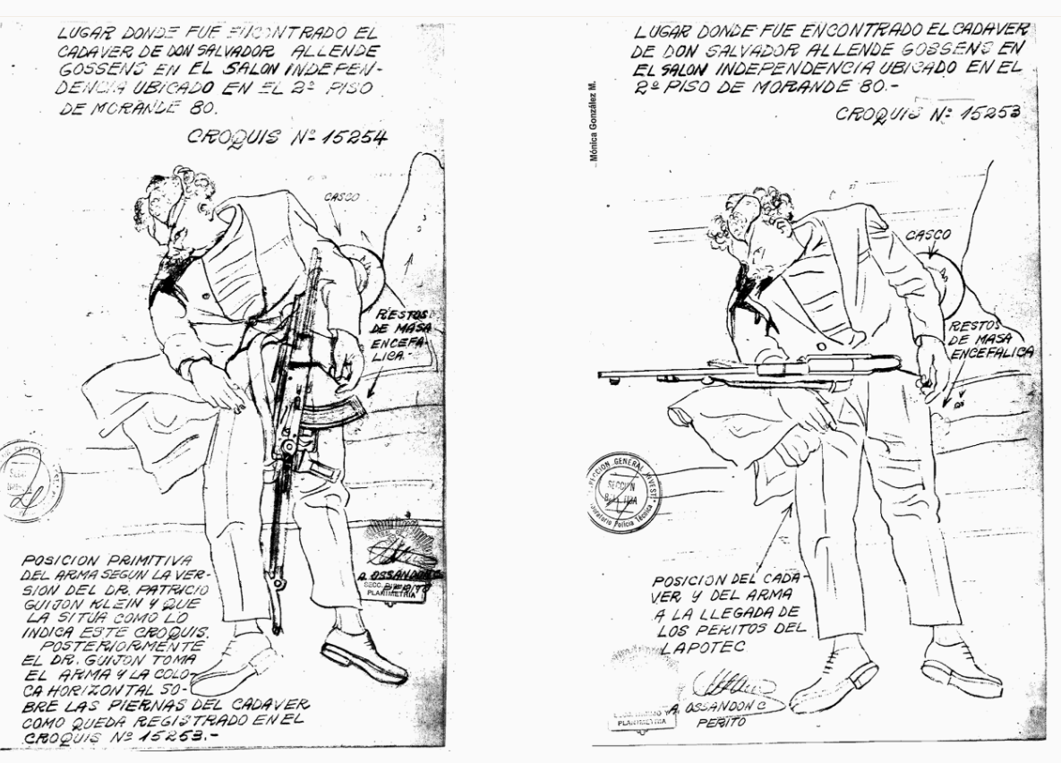 Aún no aparece el set de 29 fotos (ordenadas desde la A hasta la Z) que los peritos de la Policía Técnica de Investigaciones tomaron en el sitio del suceso. El General Palacios se quedó con el fusil AK-47 con el que –supuestamente- Allende se suicidó.