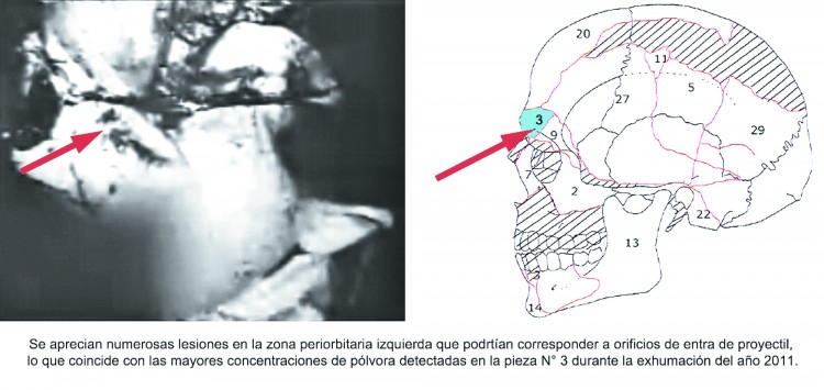 Este disparo de entrada de proyectil en la frente se alinea perfectamente con el “orificio redondeado de salida de proyectil tallado a bisel externo” con el que quedó el cráneo de Allende tras el asalto a La Moneda, según consta en el informe de la autopsia Nº 2449/73. Esta fue realizada la noche del 11 de septiembre de 1973 en el Hospital Militar por el médico legista Tomás Tobar y el ginecólogo José Luis Vásquez.